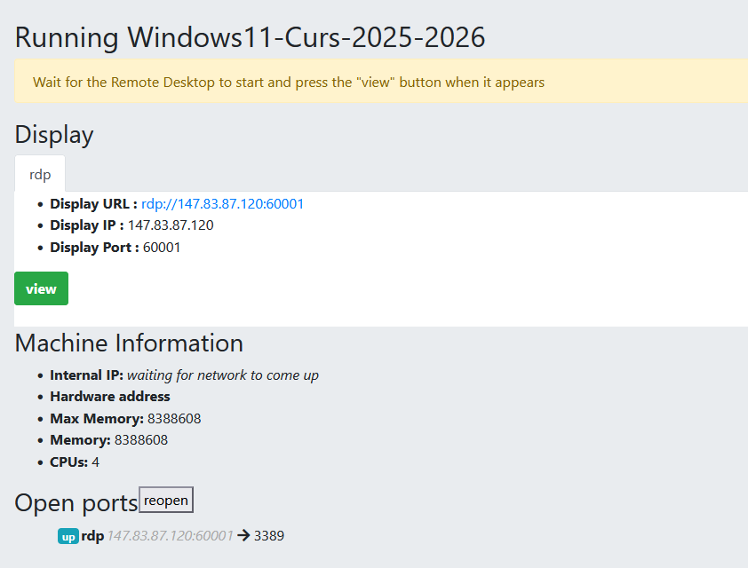 4. Un cop l'equip estigui preparat, la web us retornarà un fitxer RDP que haureu d'obrir amb la vostra aplicació Remote Desktop.