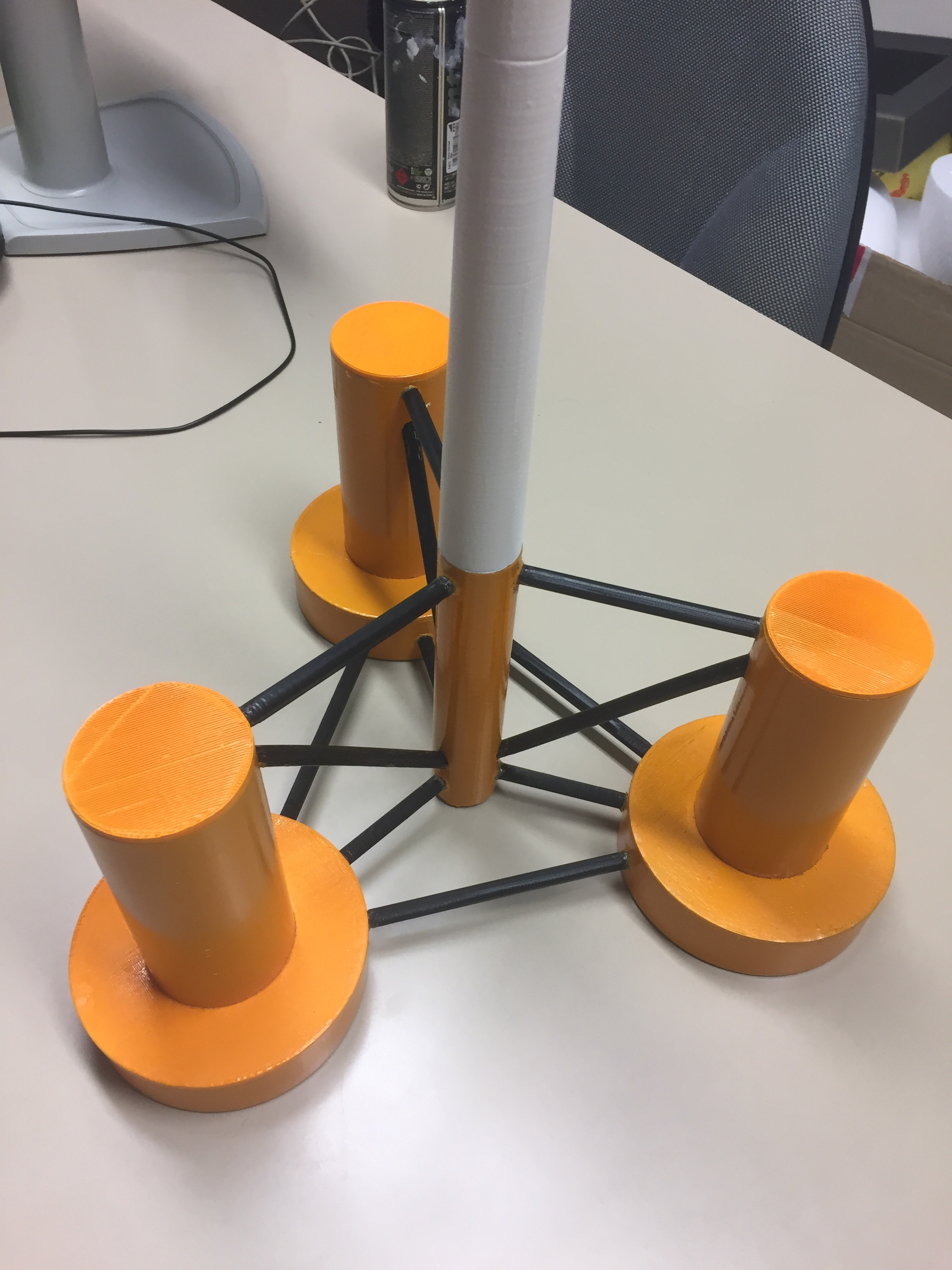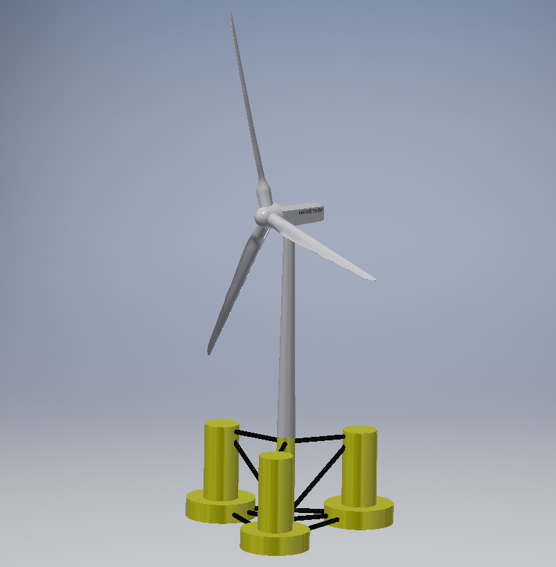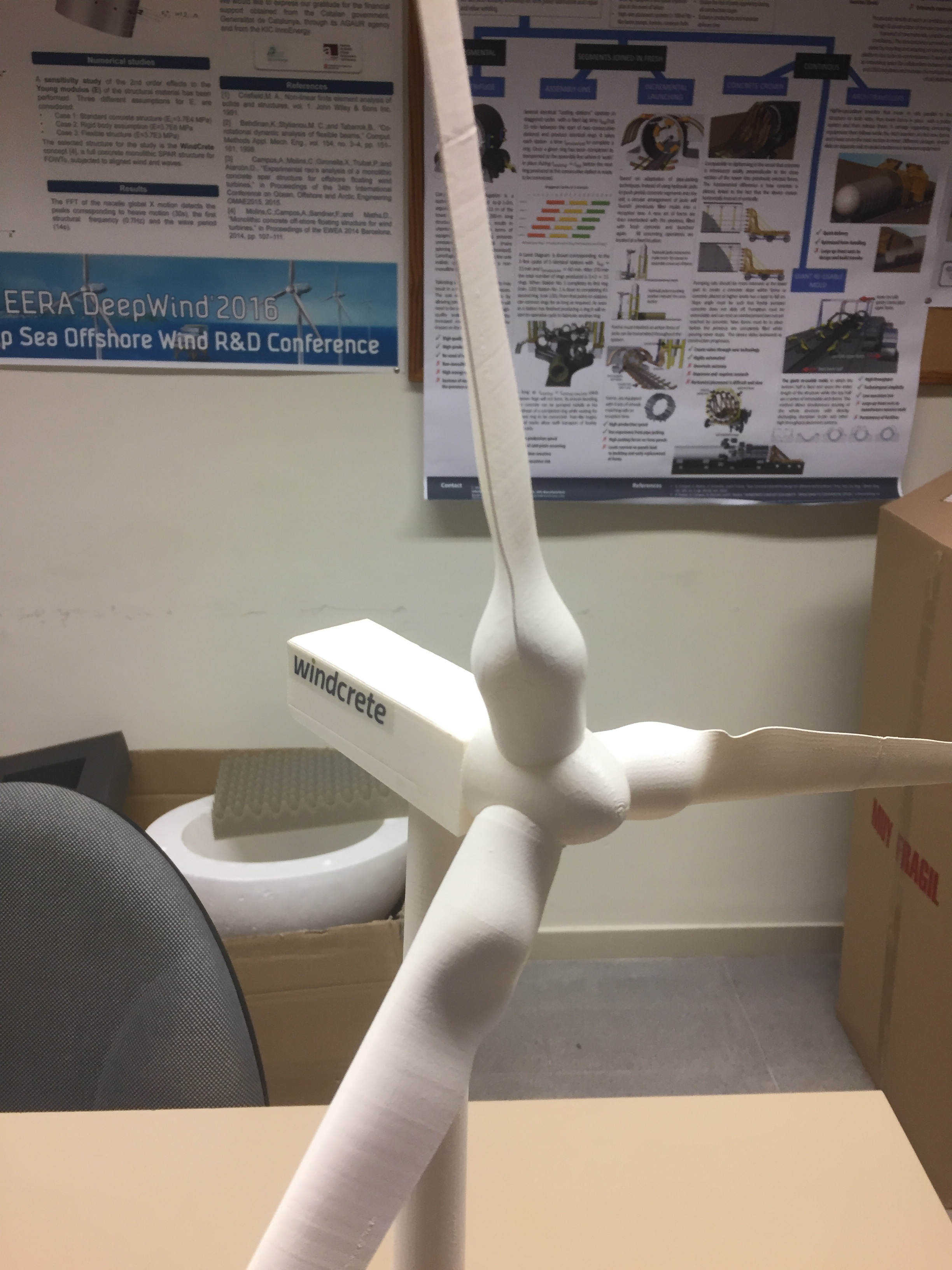 Cada flotador consta quatre peces: base amb cilindre inferior de diàmetre gran, tapa superior del cilindre inferior, cilindre superior i la seva tapa. El cilindre que suporta la torre és una impressió. La torre està feta de dos trams troncocònics, mentre que la góndola és una sola peça. El hub on arrenquen les pales és massís amb els forats per encastar-hi les pales que es van imprimir en dos trams.